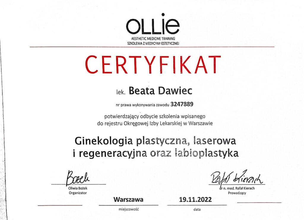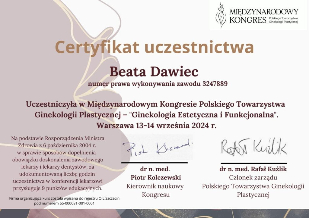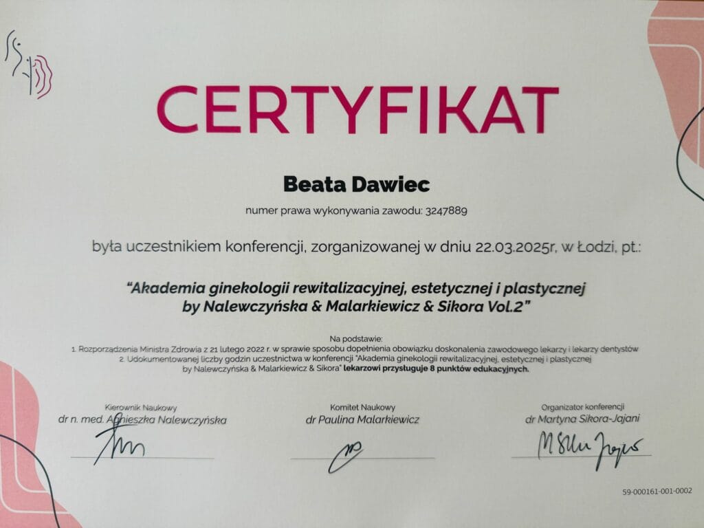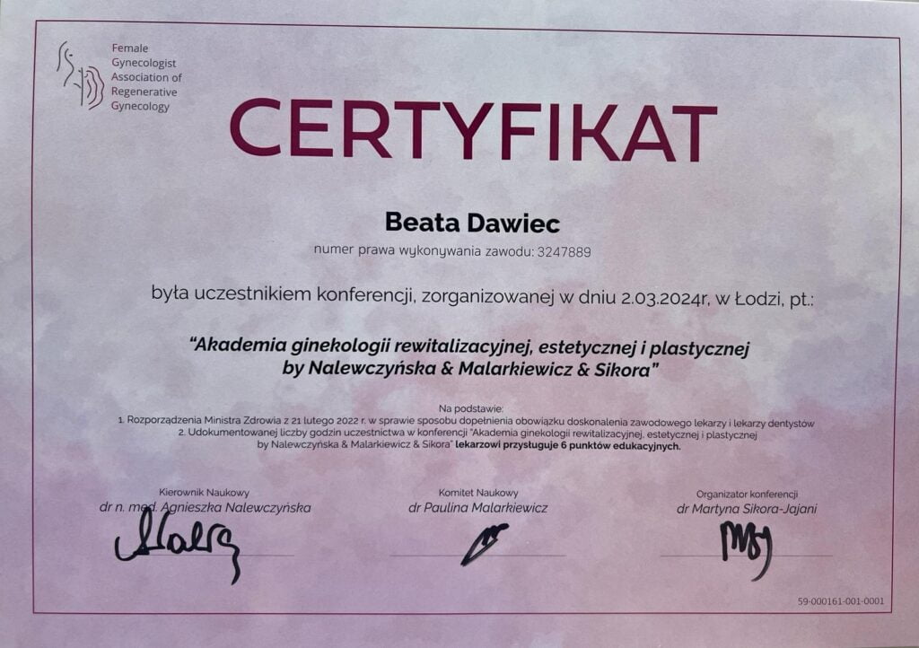 W 2015 roku skończyła Wydział Lekarski Uniwersytetu Medycznego im. Piastów Śląskich we Wrocławiu. Od 2016 roku pracuje w II Klinice Ginekologii i Położnictwa Uniwersyteckiego Szpitala Klinicznego we Wrocławiu. Od 2018 roku jest doktorantem w II Katedrze Ginekologii i Położnictwa Uniwersytetu Medycznego, gdzie prowadzi zajęcia ze studentami Wydziału Lekarskiego i Lekarsko-Stomatologicznego. Pani Doktor wykonuje kolposkopie, elektrokonizację szyjki macicy LEEP oraz zabiegi ginekologii estetycznej, w tym labioplastyki.