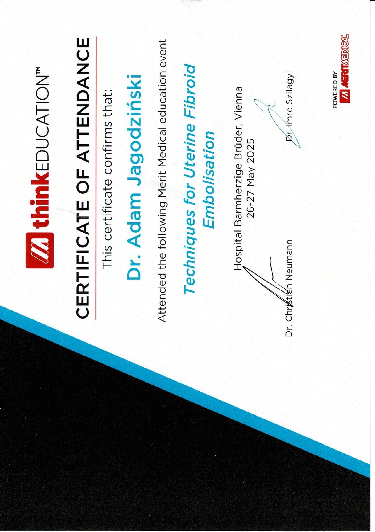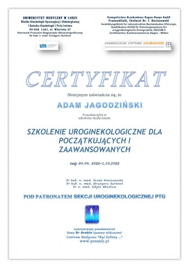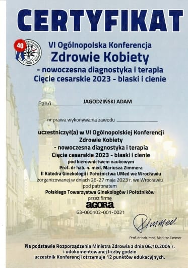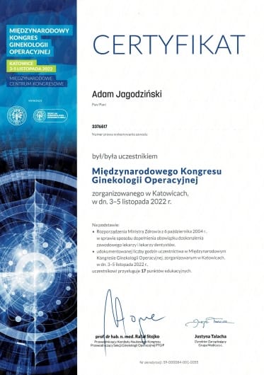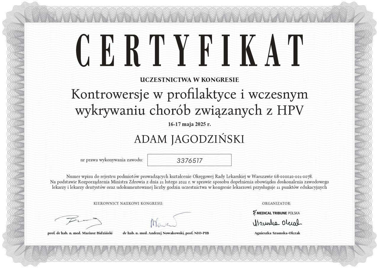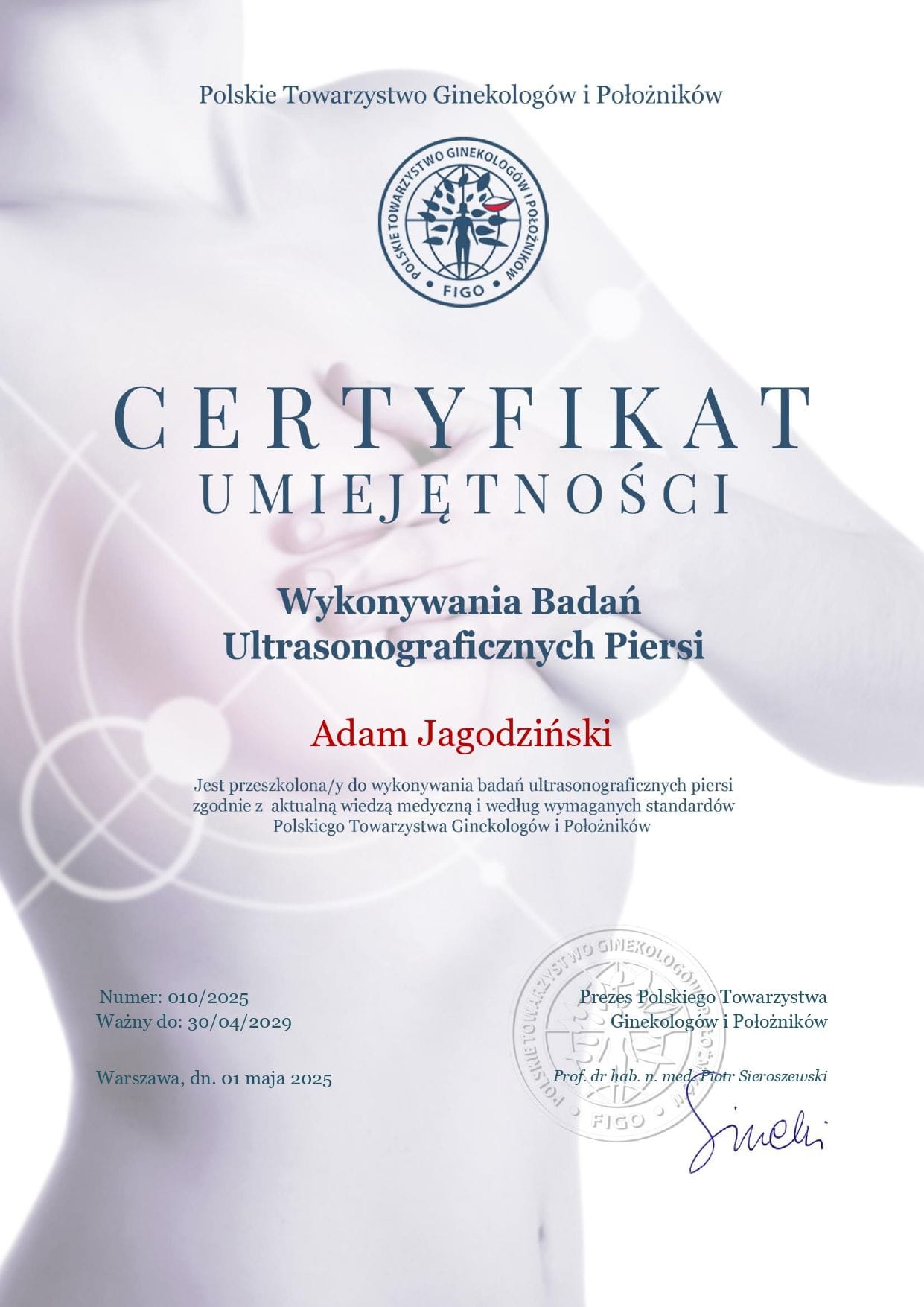 Adam Jagodziński jest specjalistą położnictwa i ginekologii. W 2017r. ukończył Wydział Lekarski Uniwersytetu Medycznego im. Piastów Śląskich we Wrocławiu z wyróżnieniem, jako jeden z dziesięciu najlepszych absolwentów. Pełni funkcję adiunkta dydaktycznego w Klinice Ginekologii Operacyjnej i Onkologicznej UMW we Wrocławiu.