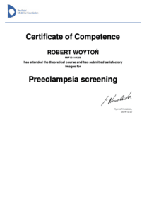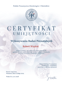 Posiada liczne certyfikaty, w tym prestiżowy międzynarodowy certyfikat The Fetal Medicine Foundation, certyfikat Sekcji Ultrasonografii Polskiego Towarzystwa Ginekologicznego oraz dokumenty potwierdzające jego umiejętności w zakresie ginekologii plastycznej i estetycznej. Jest członkiem Polskiego Towarzystwa Ginekologów i Położników oraz Europejskiego Towarzystwa Ginekologii Estetycznej (Senior Member – E.S.A.G.).