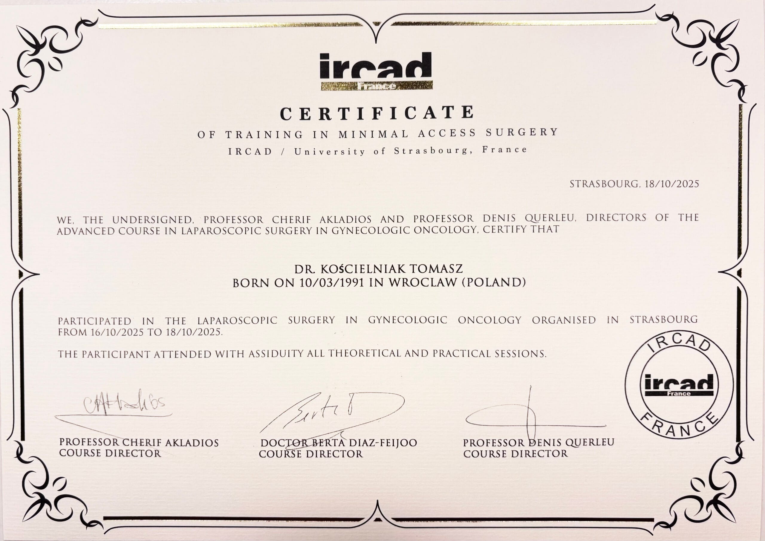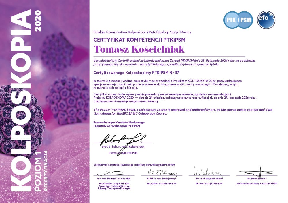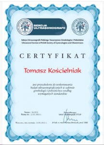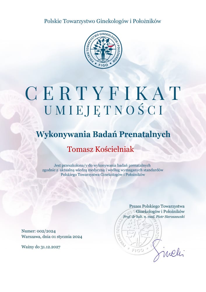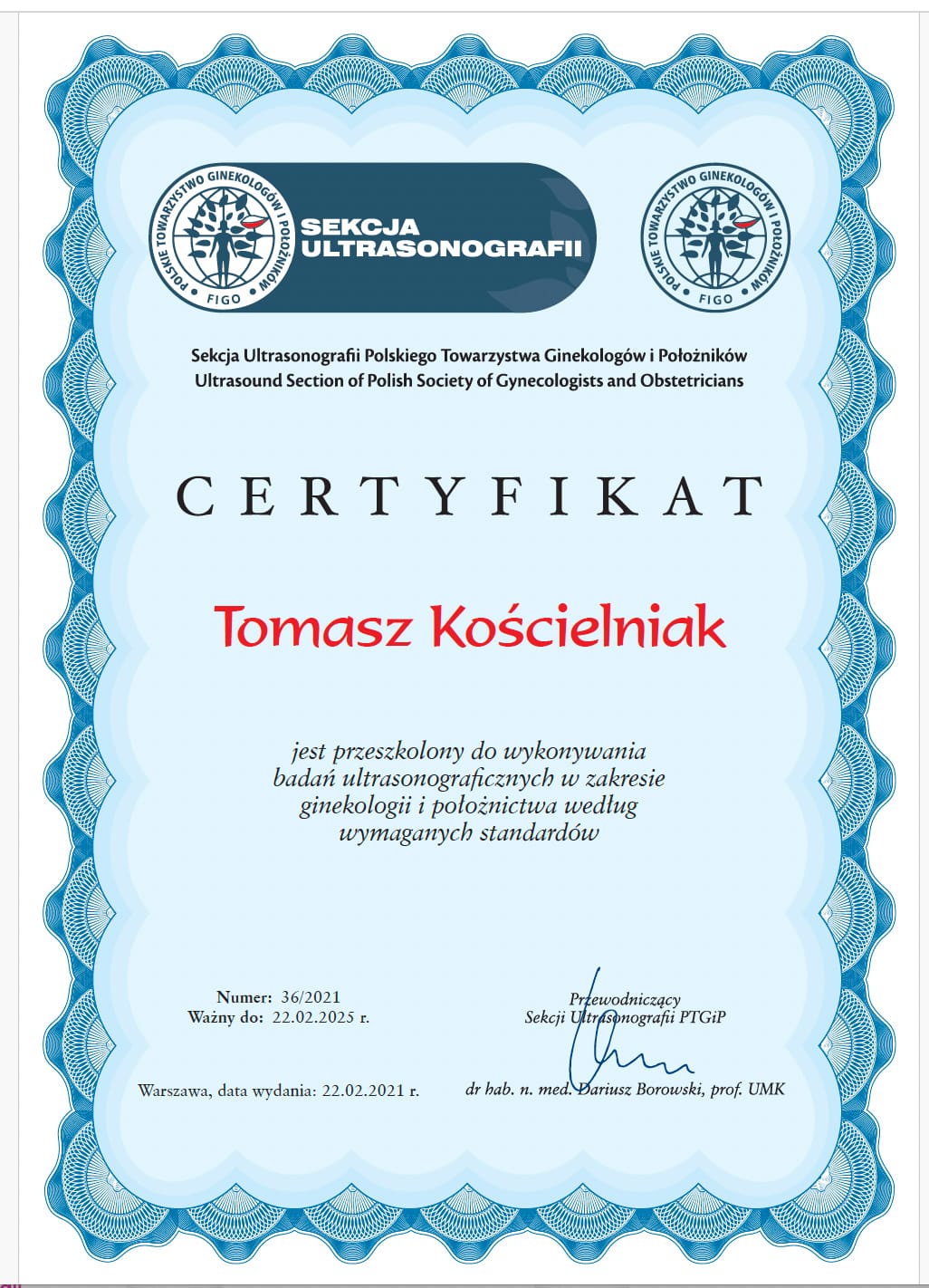 Dr Tomasz Kościelniak jest absolwentem Uniwersytetu Medycznego im. Piastów Śląskich we Wrocławiu. Pracuje na Klinicznym Oddziale Ginekologii Onkologicznej i Prokreacyjnej w 4 Wojskowym Szpitalu Klinicznym we Wrocławiu oraz dyżuruję na Oddziale Ginekologii i Położnictwa w szpitalu „Latawiec” w Świdnicy. Jestem członkiem Polskiego Towarzystwa Ginekologicznego, Międzynarodowego Towarzystwa Ultrasonografii w Położnictwie i Ginekologii (ISUOG) oraz Europejskiego Towarzystwa Ginekologii Onkologicznej (ESGO). W pracy zawodowej interesuje się szczególnie leczeniem operacyjnym schorzeń narządu rodnego(histeroskopia, laparoskopia) oraz diagnostyką prenatalną. Posiadam m. in. certyfikat The Fetal Medicine Foundation na wykonywanie badań prenatalnych, certyfikat wykonywania badań prenatalnych sekcji ultrasonografii Polskiego Towarzystwa Ginekologów i Położników oraz certyfikat Polskiego Towarzystwa Kolposkopii i Patofizjologii Szyjki Macicy.