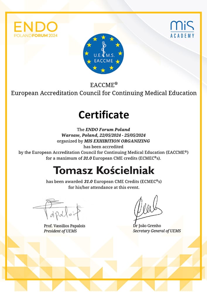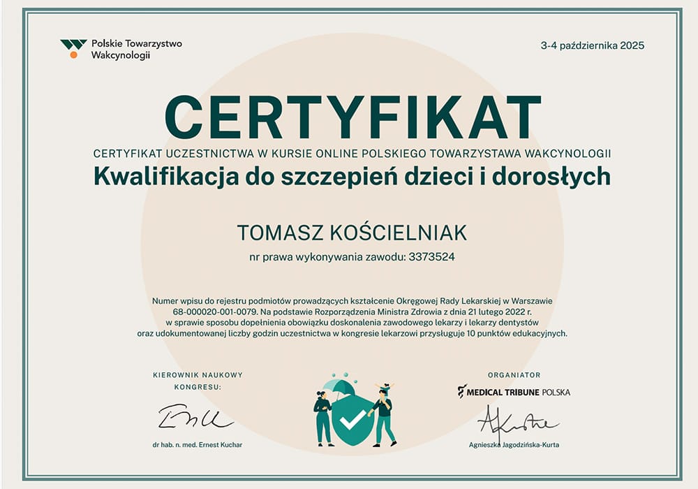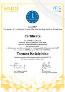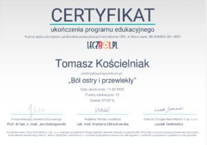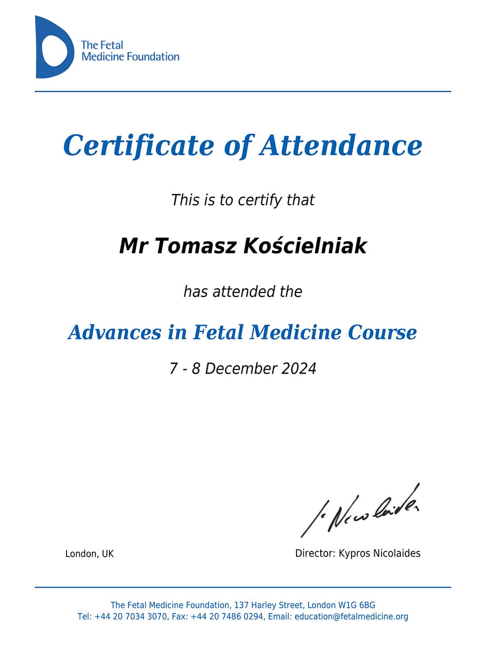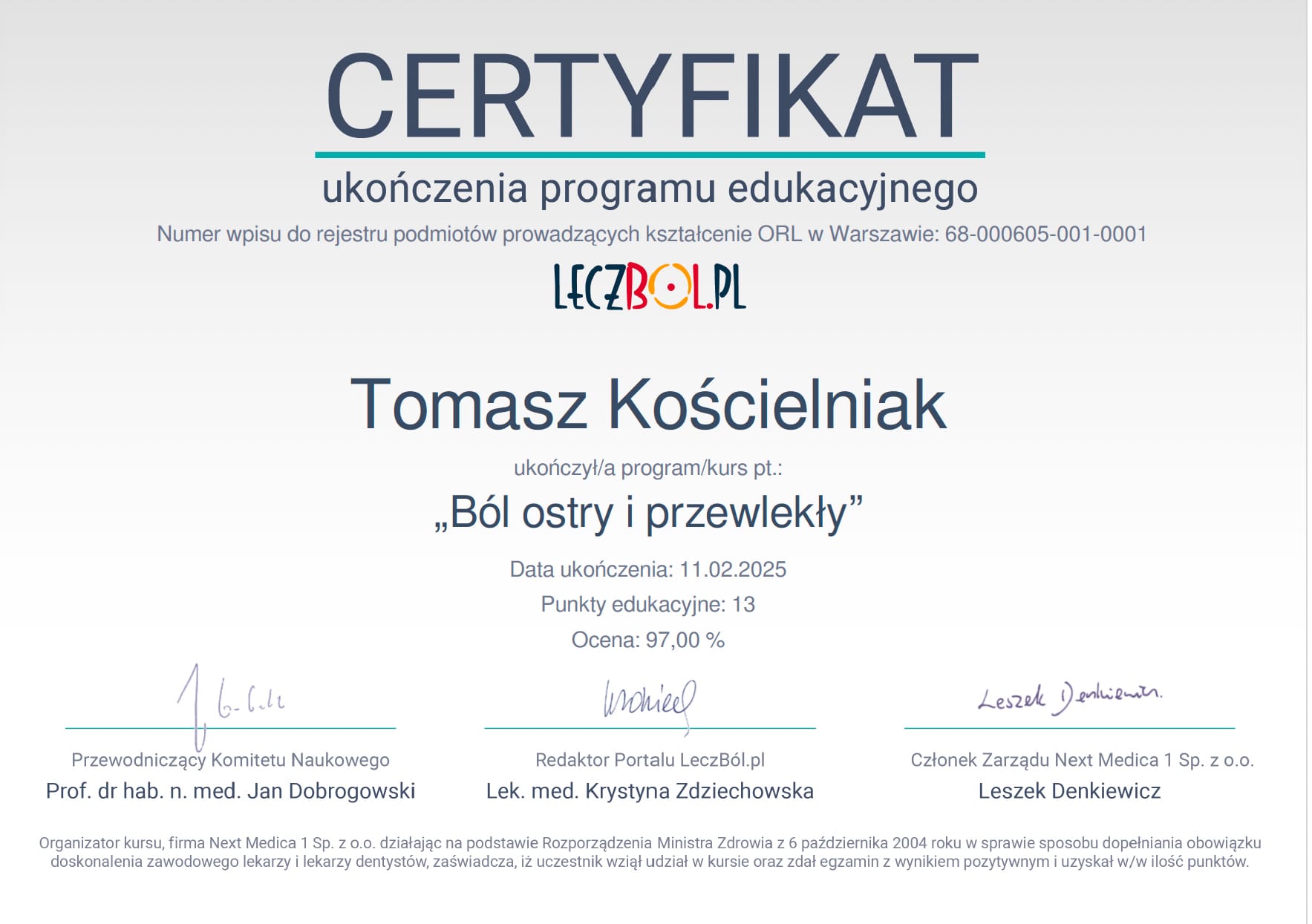 Dr Tomasz Kościelniak jest absolwentem Uniwersytetu Medycznego im. Piastów Śląskich we Wrocławiu. Pracuje na Klinicznym Oddziale Ginekologii Onkologicznej i Prokreacyjnej w 4 Wojskowym Szpitalu Klinicznym we Wrocławiu oraz dyżuruję na Oddziale Ginekologii i Położnictwa w szpitalu „Latawiec” w Świdnicy. Jestem członkiem Polskiego Towarzystwa Ginekologicznego, Międzynarodowego Towarzystwa Ultrasonografii w Położnictwie i Ginekologii (ISUOG) oraz Europejskiego Towarzystwa Ginekologii Onkologicznej (ESGO). W pracy zawodowej interesuje się szczególnie leczeniem operacyjnym schorzeń narządu rodnego(histeroskopia, laparoskopia) oraz diagnostyką prenatalną. Posiadam m. in. certyfikat The Fetal Medicine Foundation na wykonywanie badań prenatalnych, certyfikat wykonywania badań prenatalnych sekcji ultrasonografii Polskiego Towarzystwa Ginekologów i Położników oraz certyfikat Polskiego Towarzystwa Kolposkopii i Patofizjologii Szyjki Macicy.