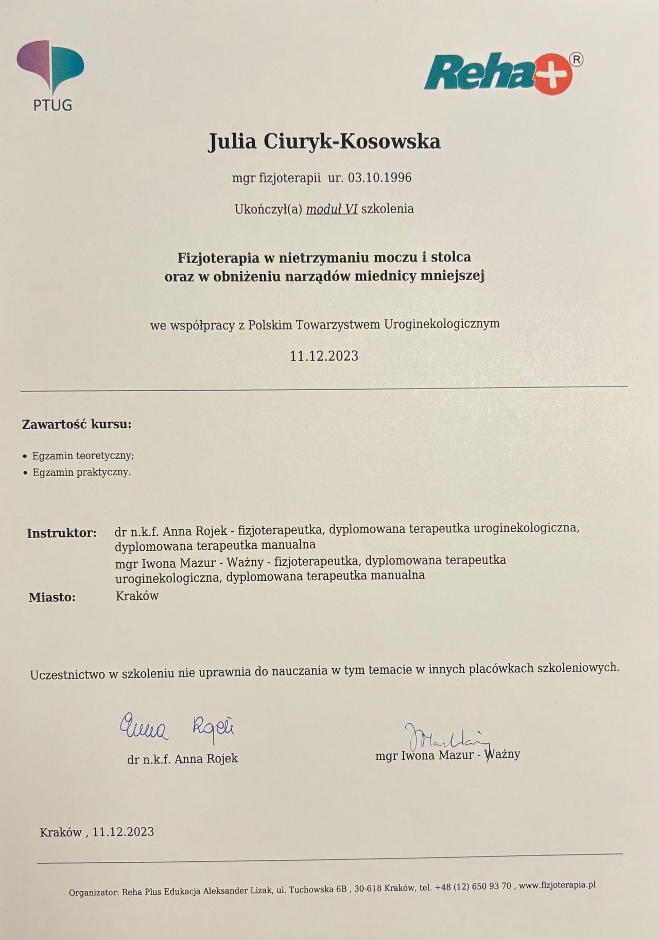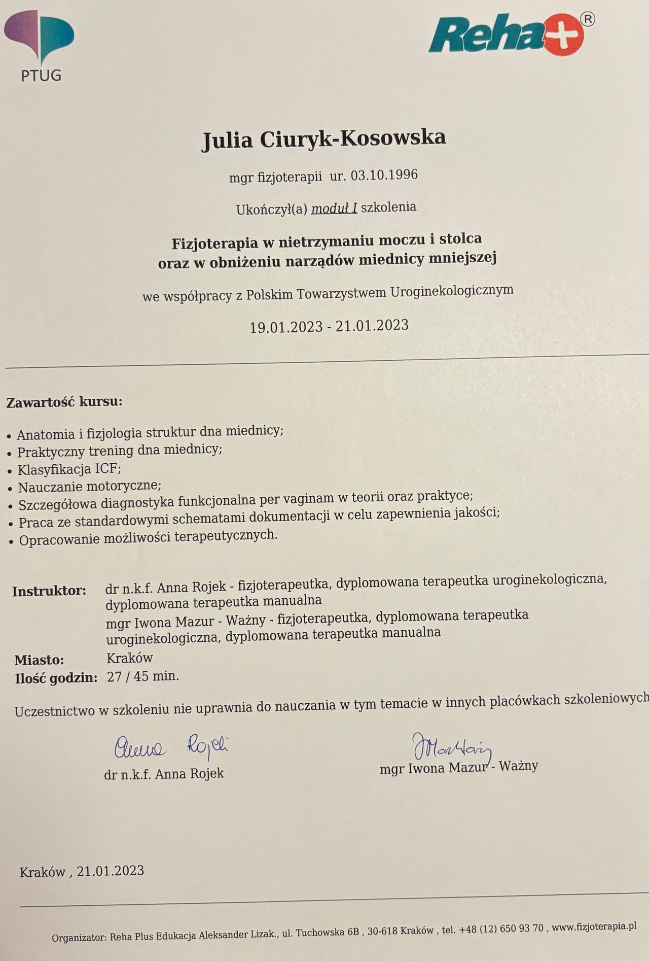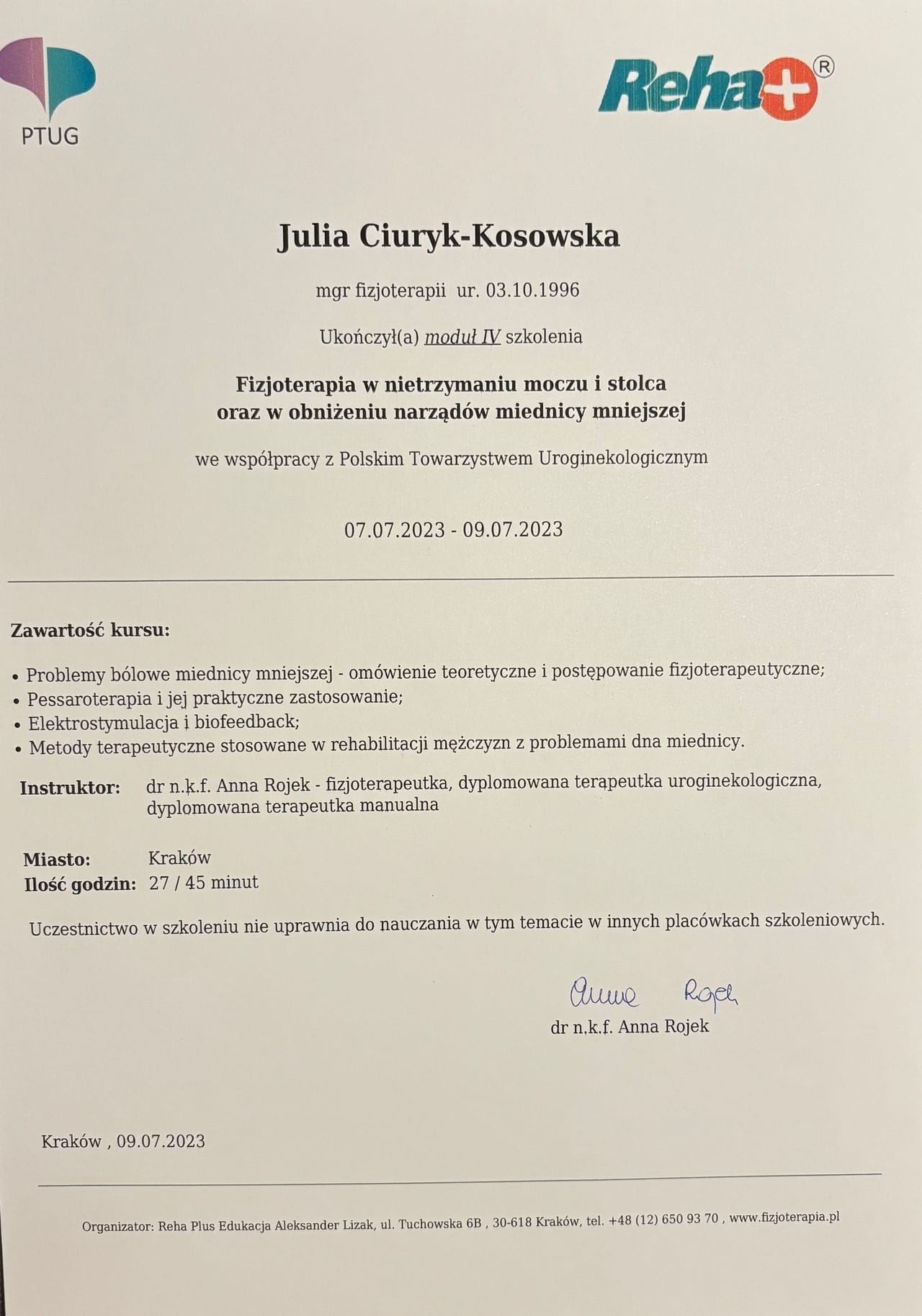 Jest certyfikowaną fizjoterapeutką uroginekologiczną Polskiego Towarzystwa Uroginekologicznego (PTUG). Ukończyła studia fizjoterapii na Collegium Medicum Uniwersytetu Jagiellońskiego w Krakowie. Jest fizjoterapeutką nie tylko z wykształcenia, ale również z pasji. Bez tabu rozmawia o zdrowiu intymnym z Pacjentkami w każdym wieku. Uświadamia, edukuje i pomaga w problemach z obszaru uroginekologii.