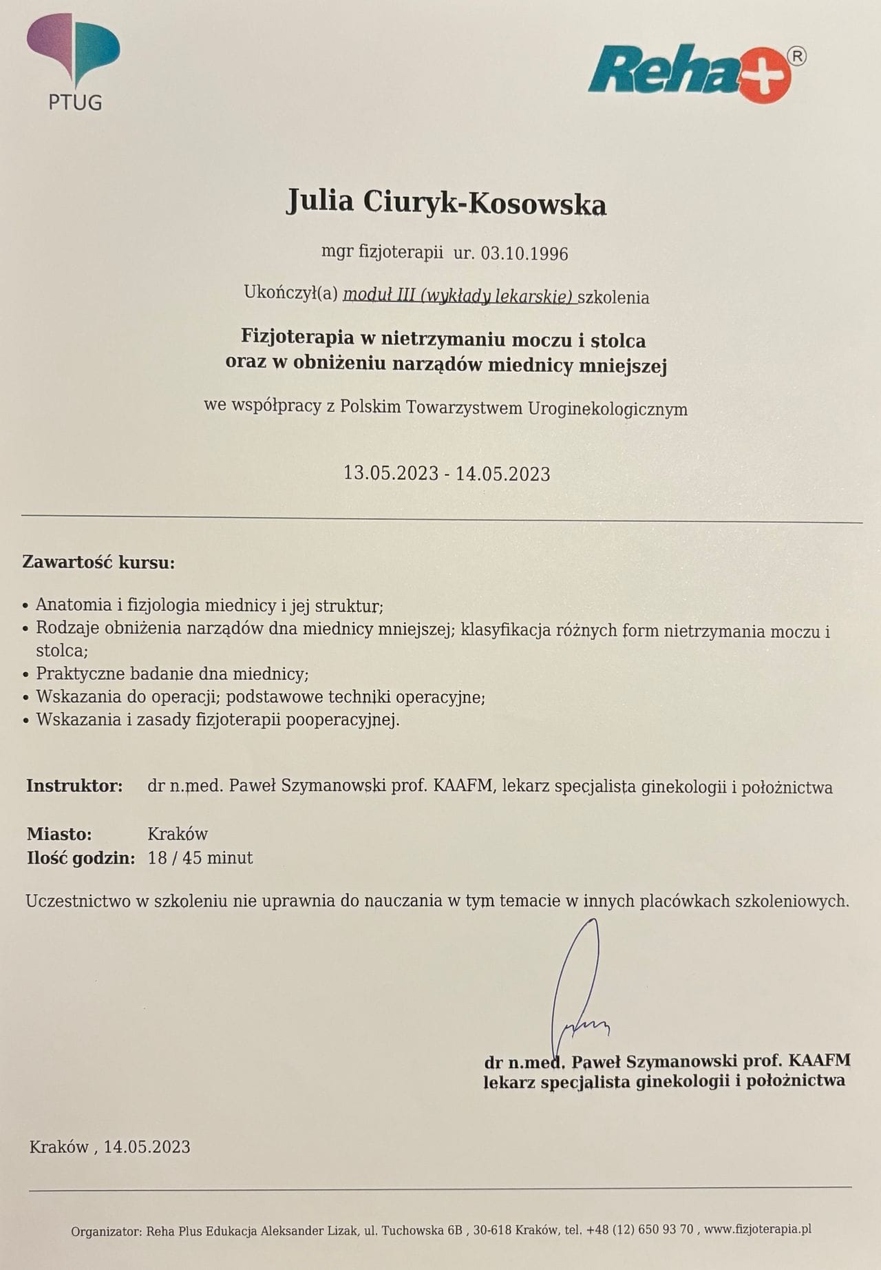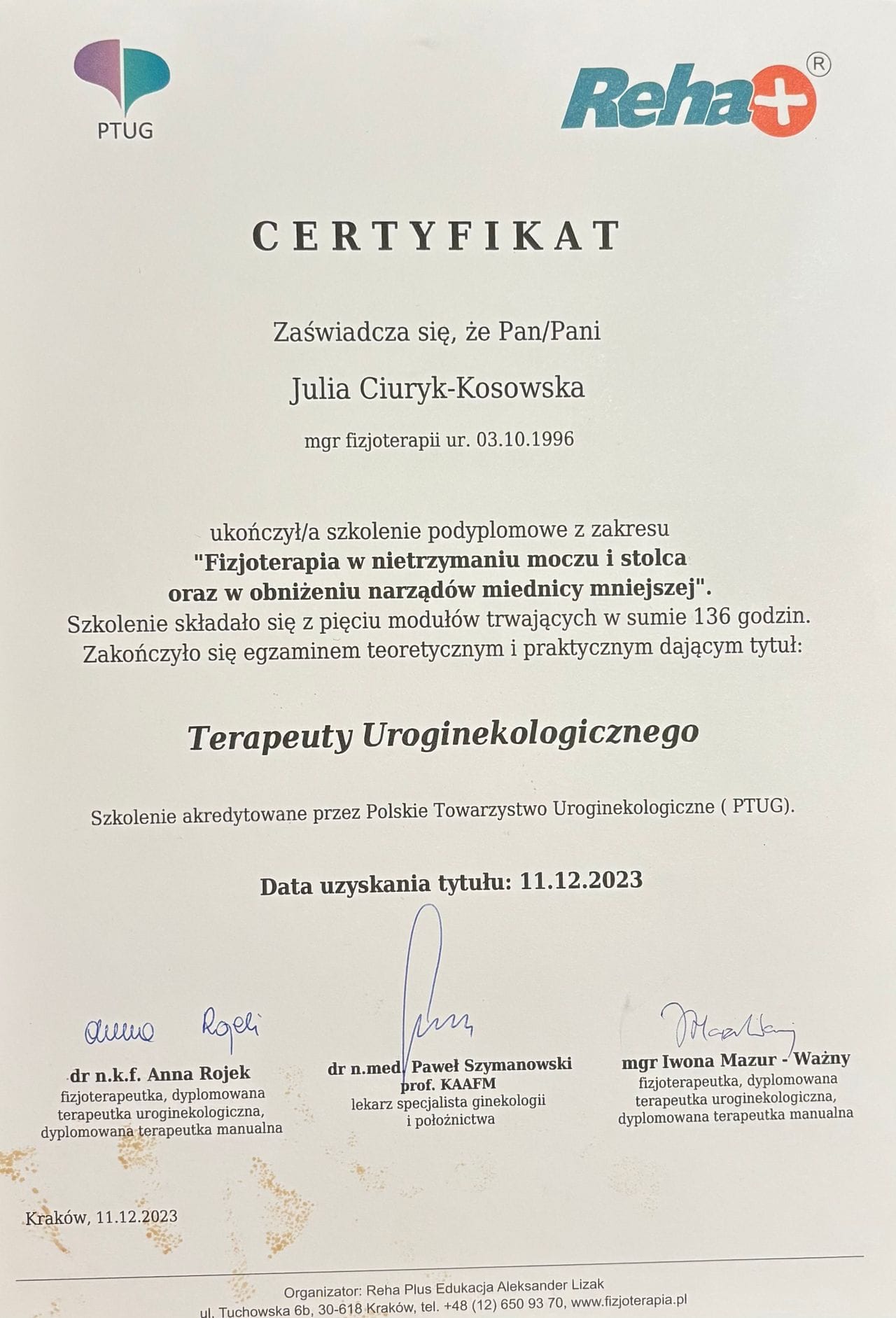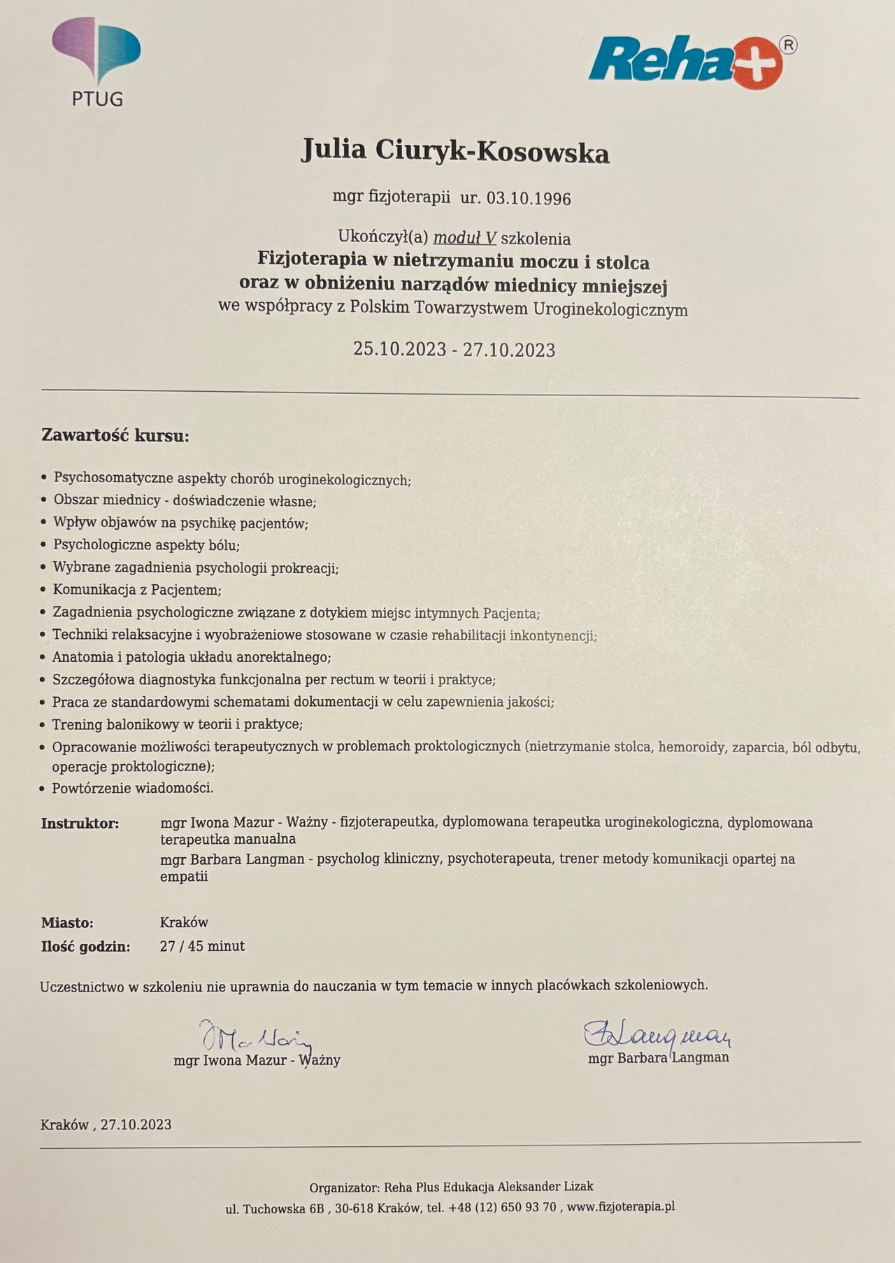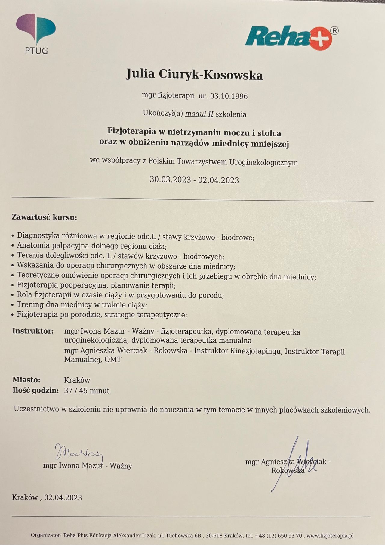 Jest certyfikowaną fizjoterapeutką uroginekologiczną Polskiego Towarzystwa Uroginekologicznego (PTUG). Ukończyła studia fizjoterapii na Collegium Medicum Uniwersytetu Jagiellońskiego w Krakowie. Jest fizjoterapeutką nie tylko z wykształcenia, ale również z pasji. Bez tabu rozmawia o zdrowiu intymnym z Pacjentkami w każdym wieku. Uświadamia, edukuje i pomaga w problemach z obszaru uroginekologii.