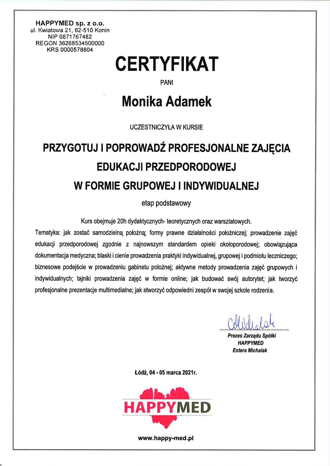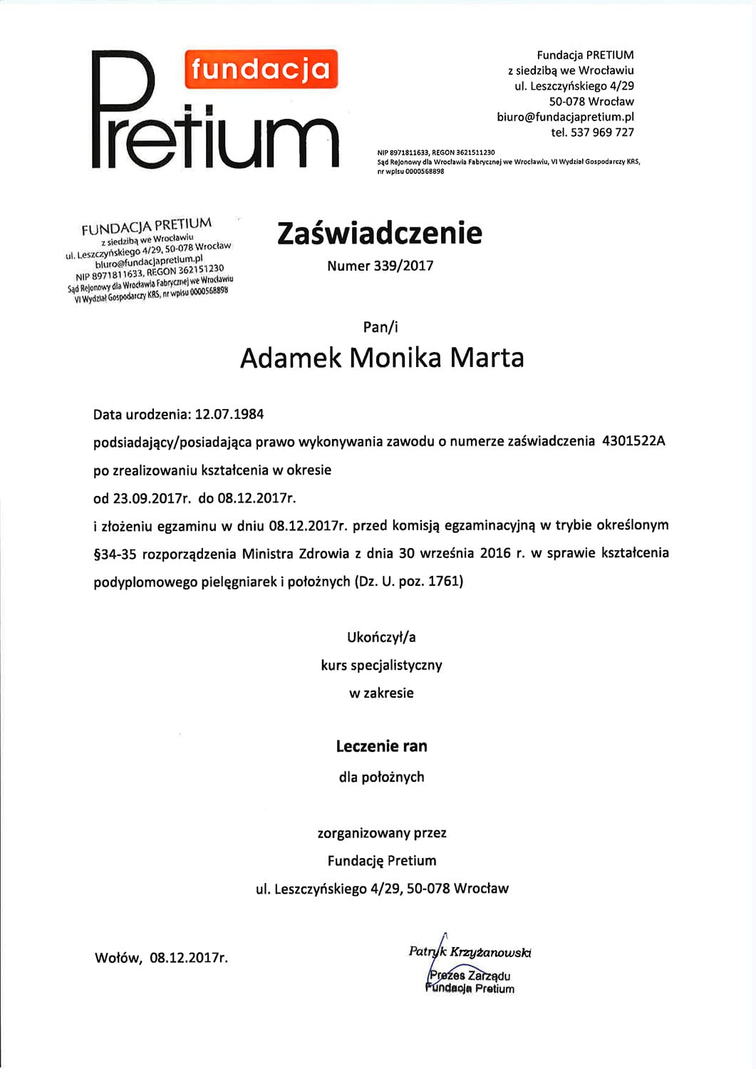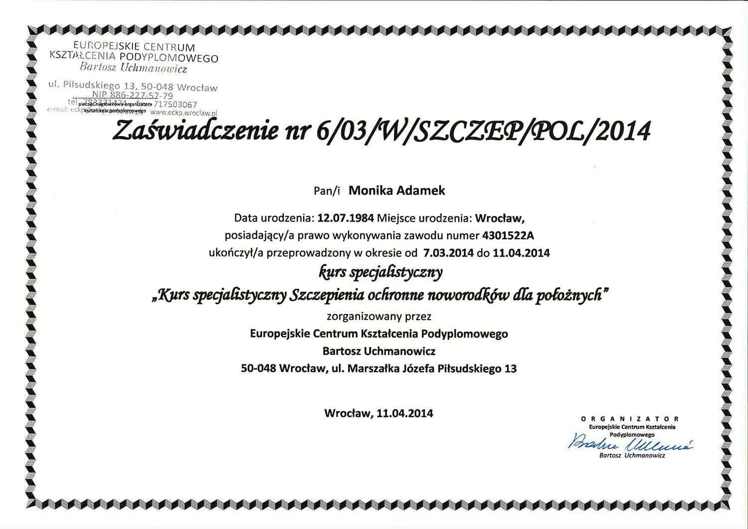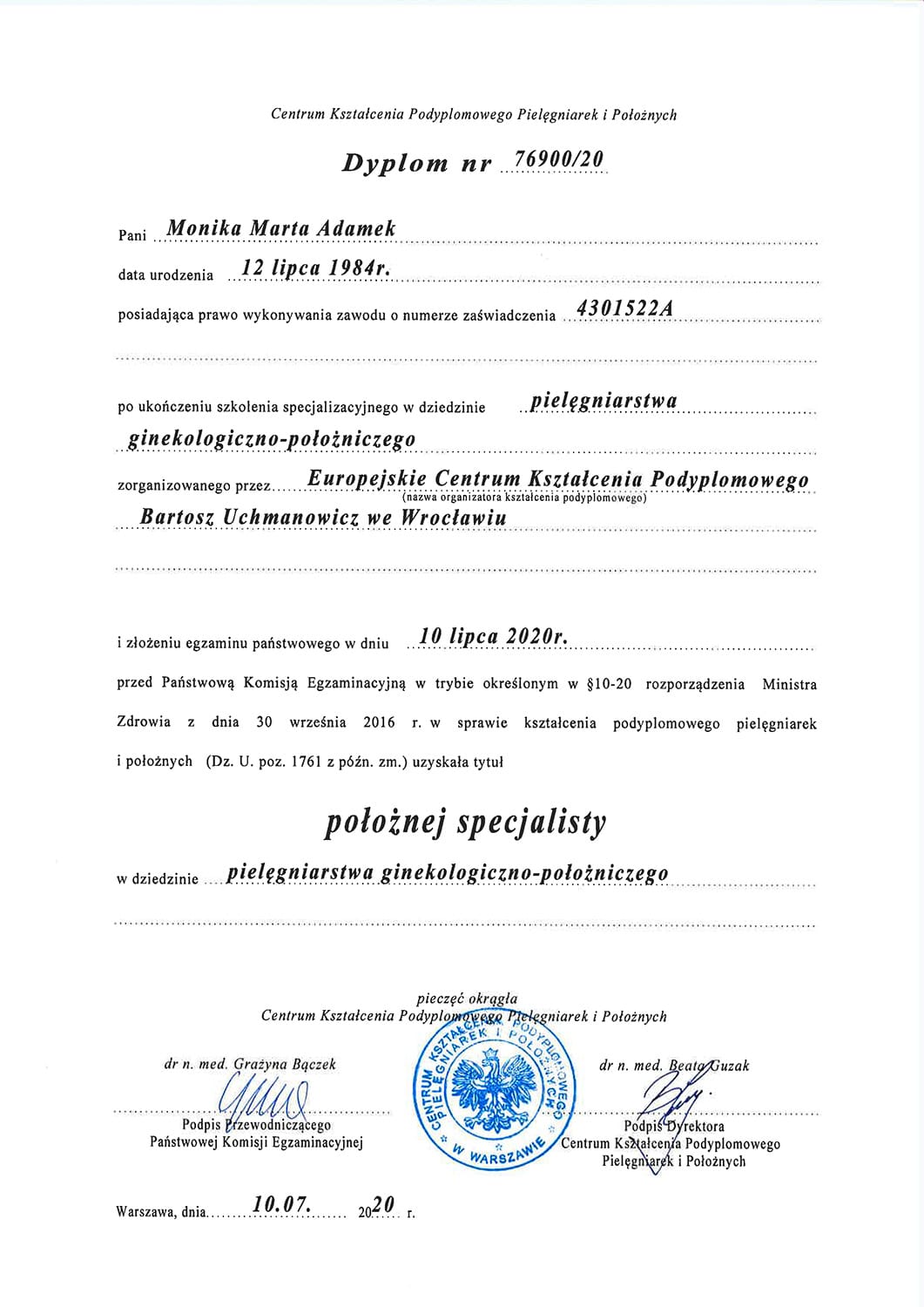 Położną jest od 2006. Tytuł magistra położnictwa zdobyła na Uniwersytecie Medycznym w Poznaniu. Jest specjalistką pielęgniarstwa położniczo-ginekologicznego oraz posiada liczne kursy specjalistyczne, w tym z zakresu leczenia ran, szczepień i doradztwa laktacyjnego.