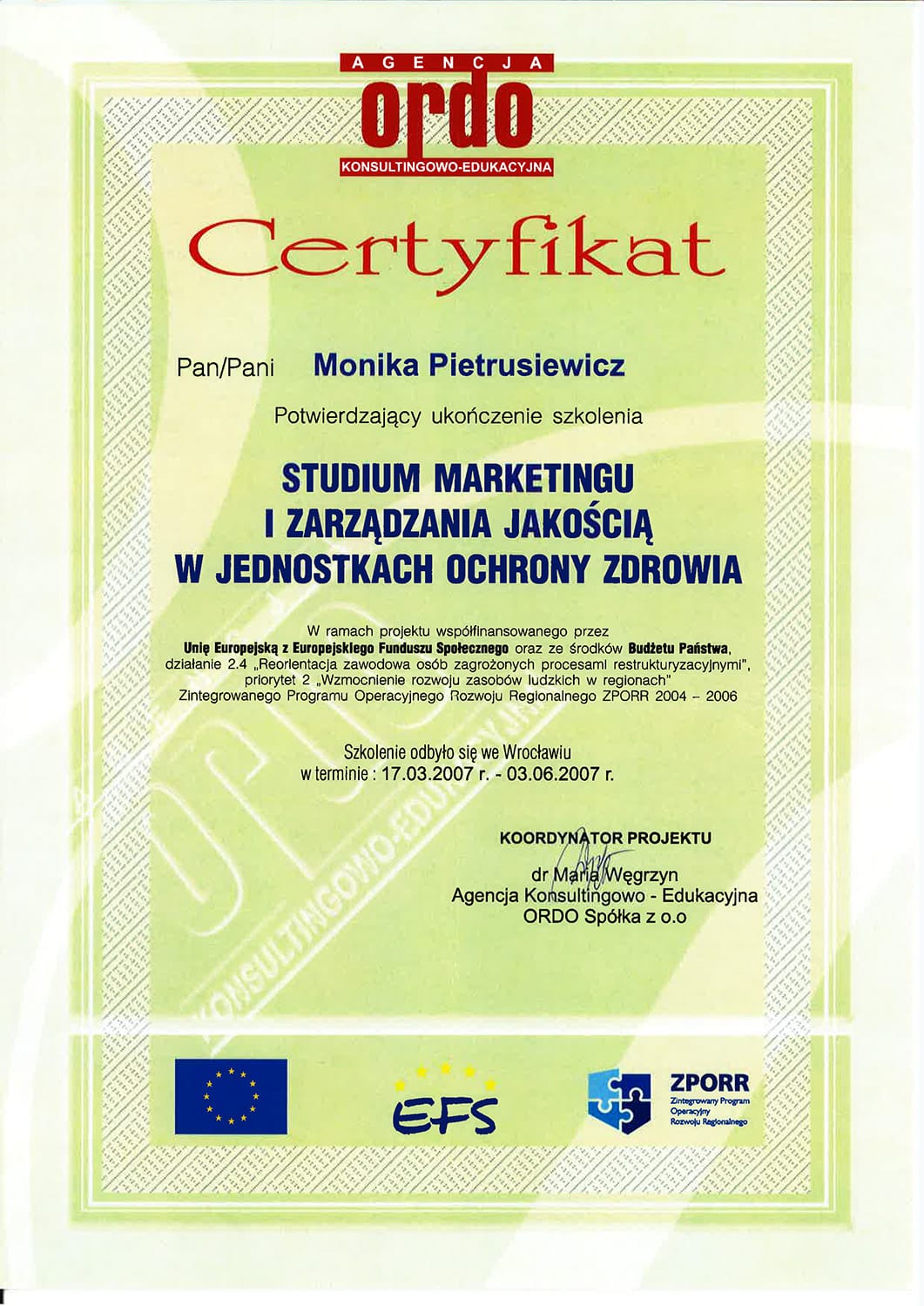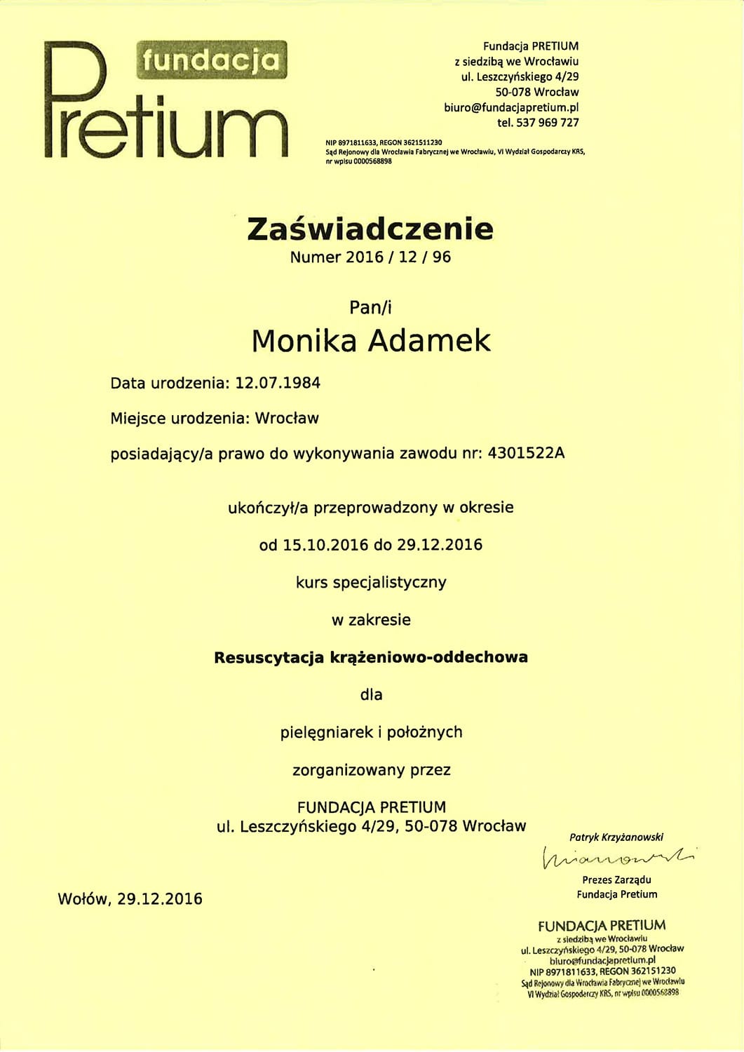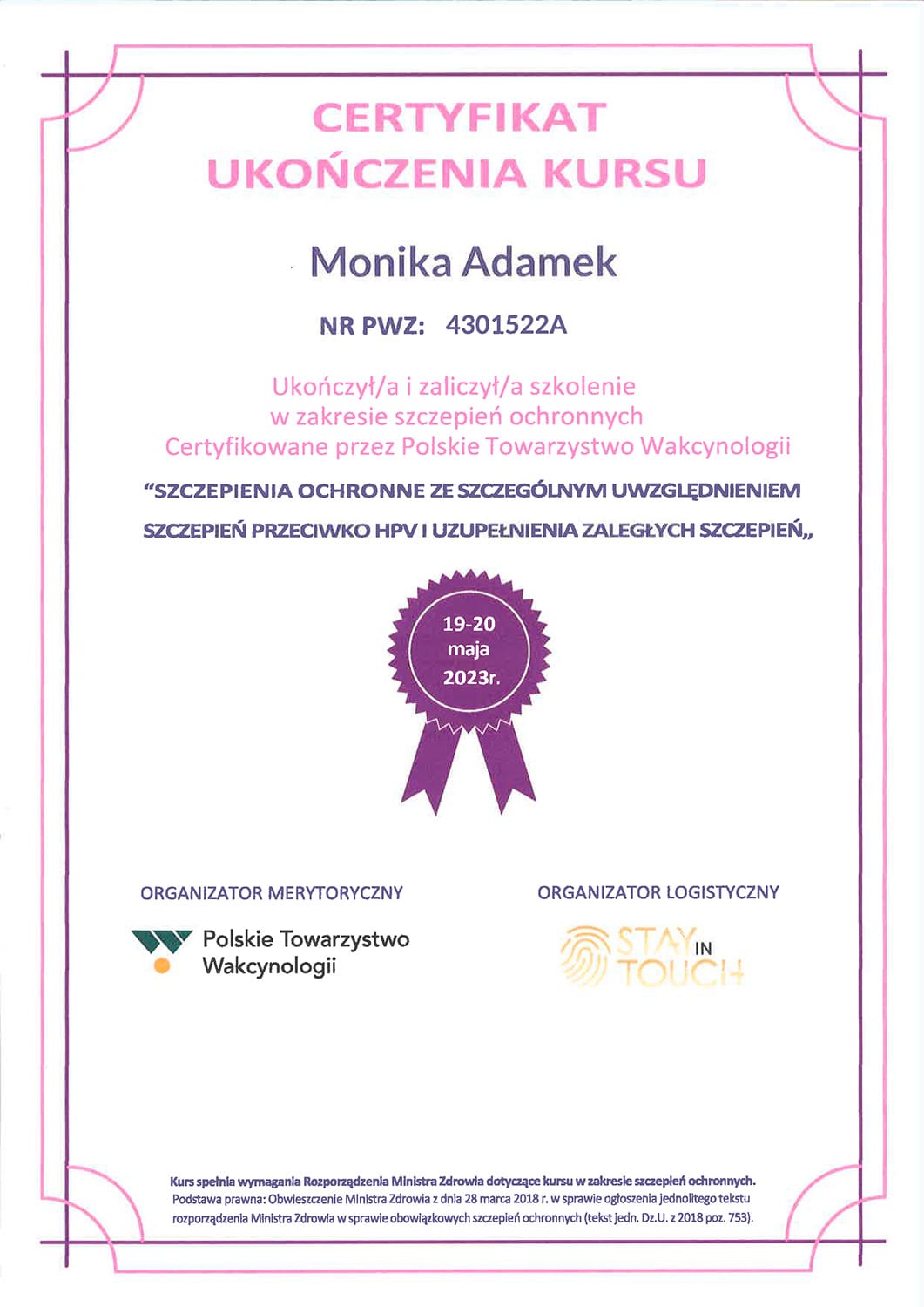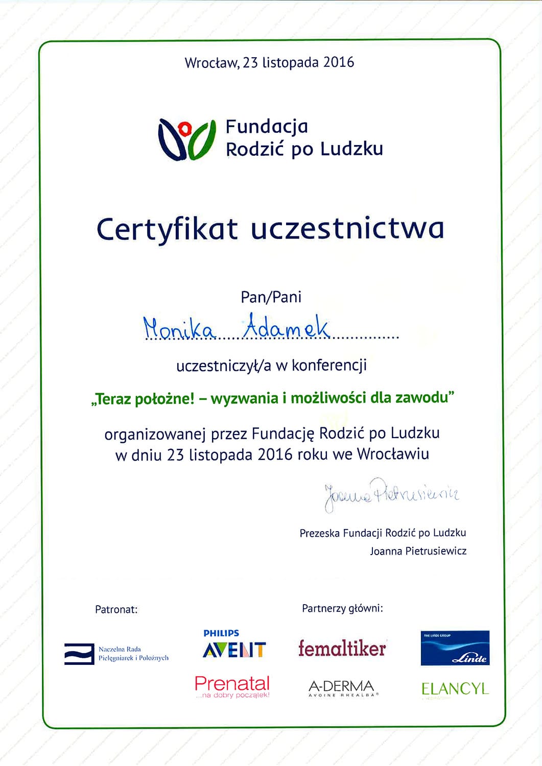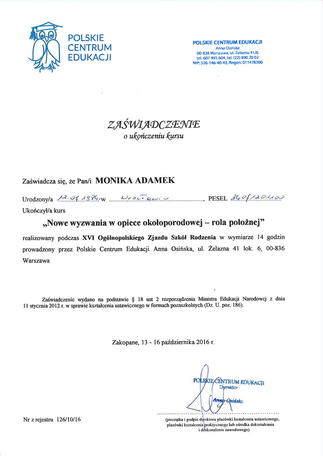 Położną jest od 2006. Tytuł magistra położnictwa zdobyła na Uniwersytecie Medycznym w Poznaniu. Jest specjalistką pielęgniarstwa położniczo-ginekologicznego oraz posiada liczne kursy specjalistyczne, w tym z zakresu leczenia ran, szczepień i doradztwa laktacyjnego.
