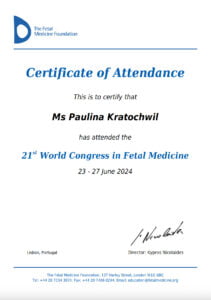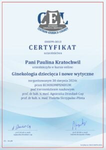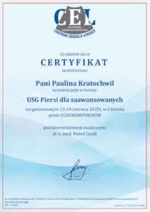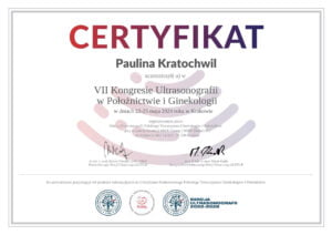 Posiada certyfikat do badań prenatalnych FMF oraz Certyfikat Sekcji Ultrasonografii Polskiego Towarzystwa Ginekologów i Położników. Jest certyfikowanym ultrasonografistą IOTA Group.